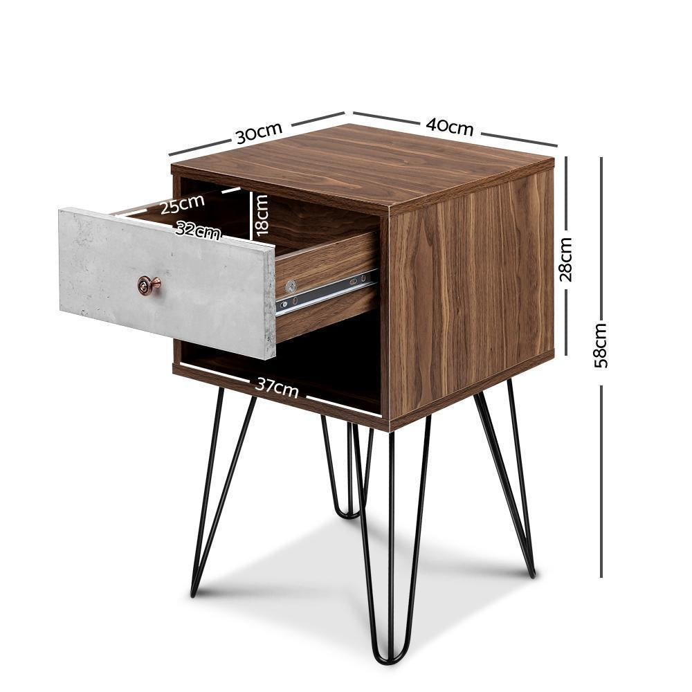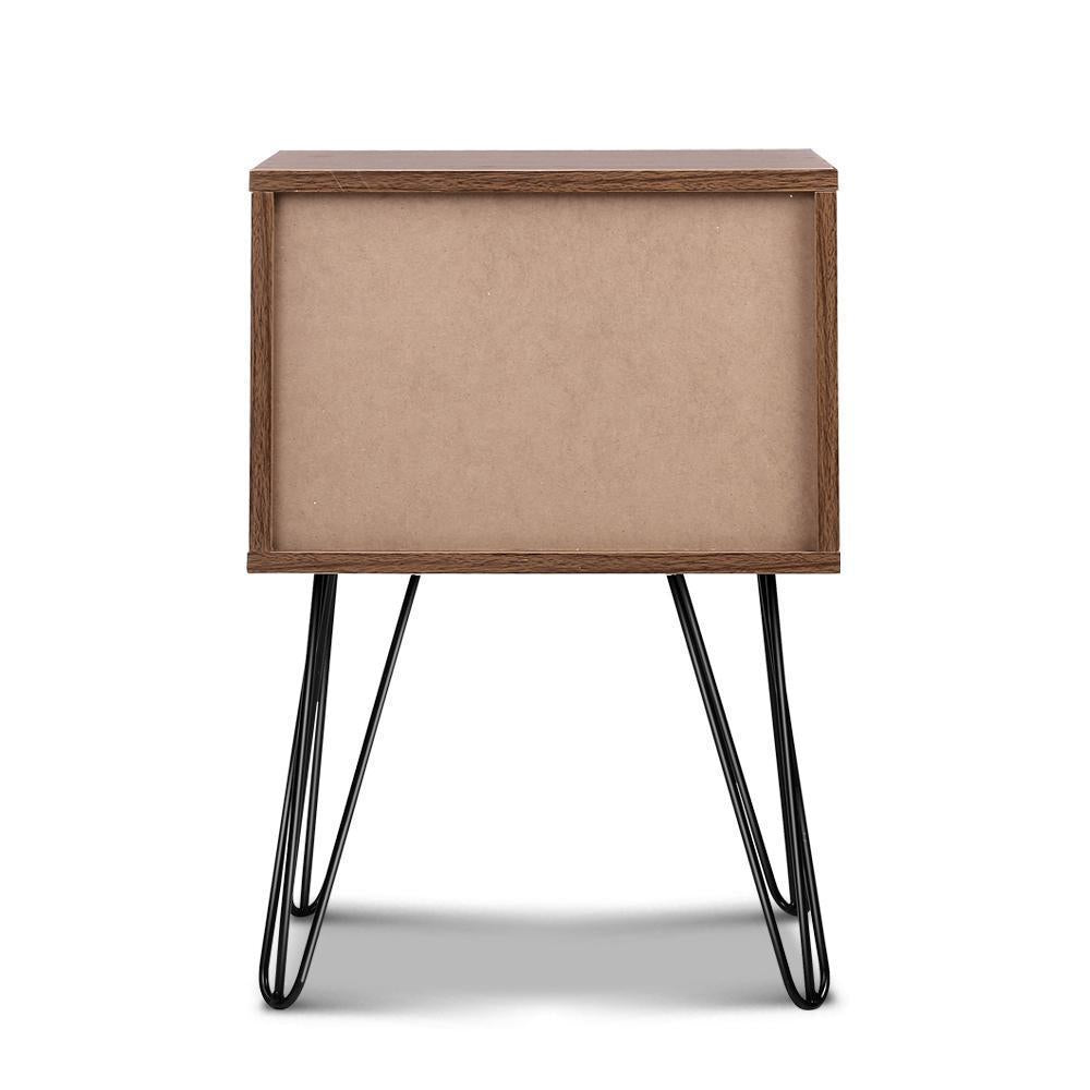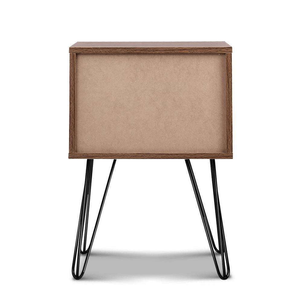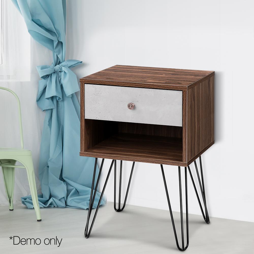 The bedside table is mde from eco friendly white E1 PB for the drawer as well as a natural dark wood grain finish. The drawer offers ample space and the angled legs are built from sturdy metal to provide stability.
