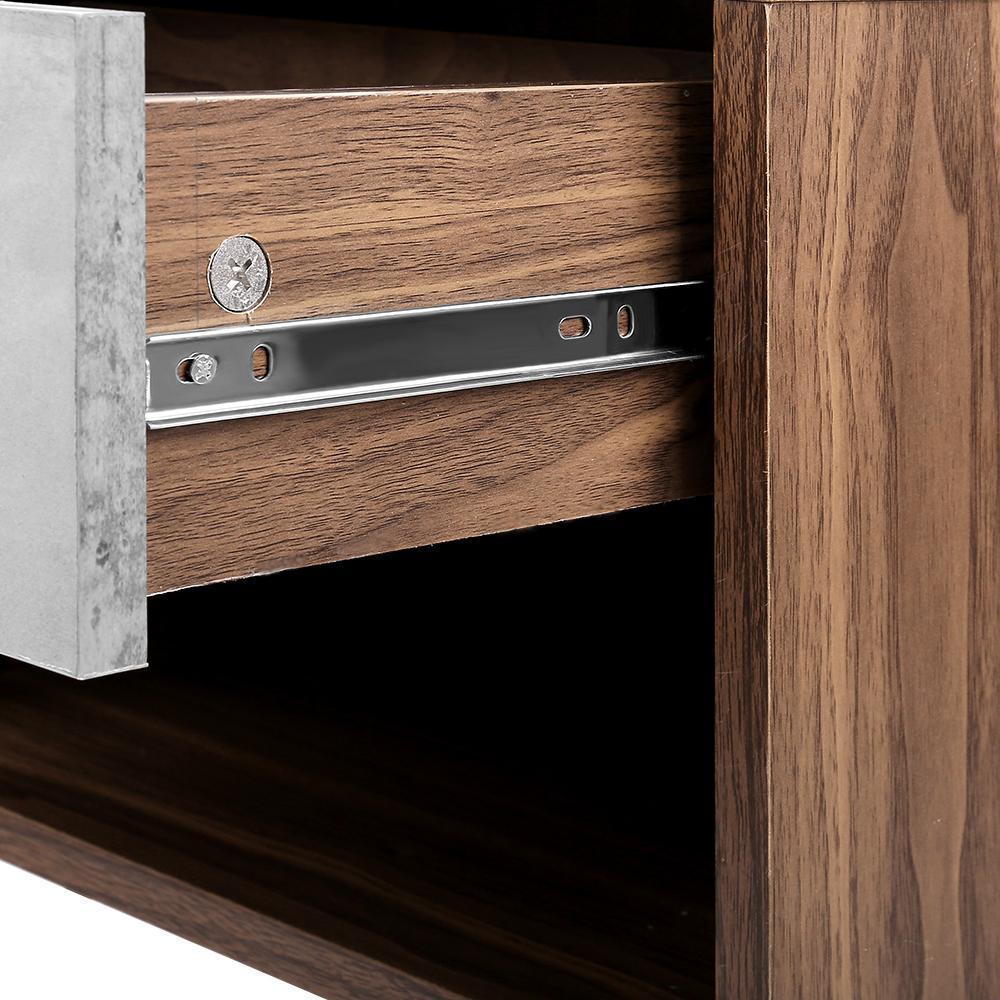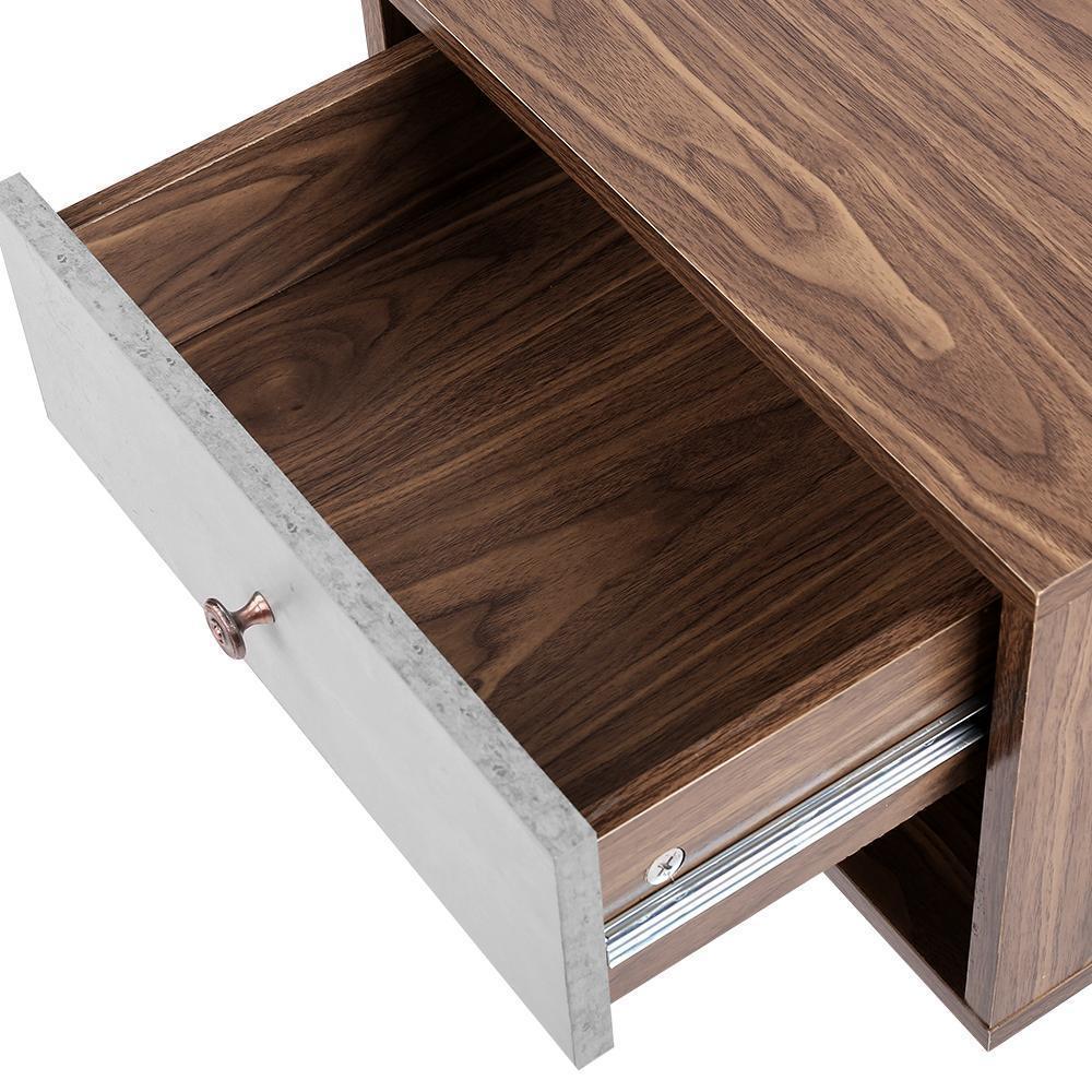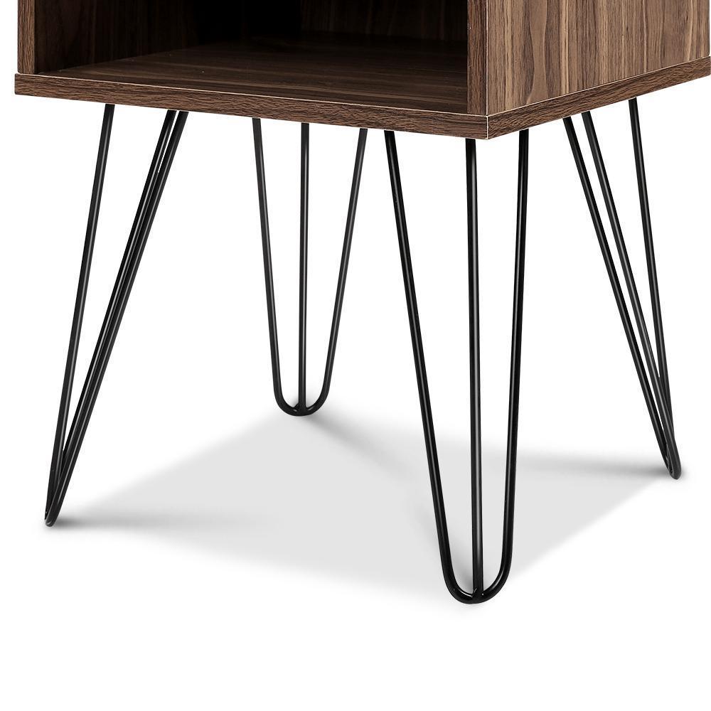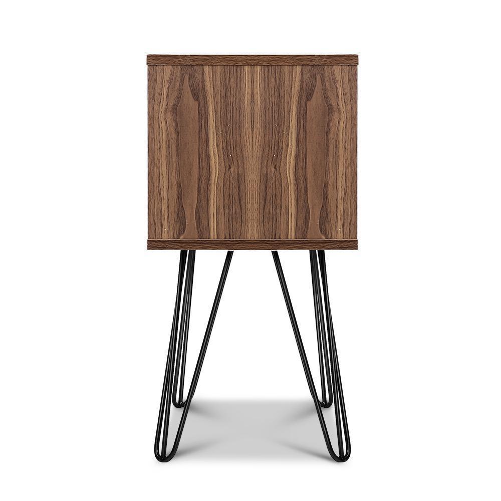 The bedside table is mde from eco friendly white E1 PB for the drawer as well as a natural dark wood grain finish. The drawer offers ample space and the angled legs are built from sturdy metal to provide stability.